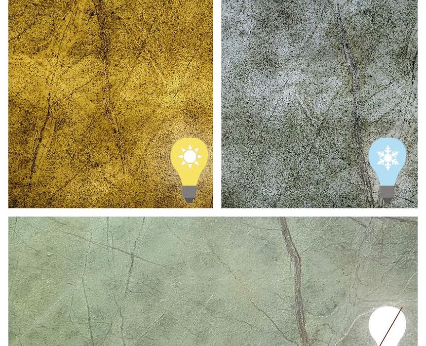 Issue de la gamme Translucide, cette feuille de pierre est composée d’une surface en pierre 100 % naturelle, associée à une résine transparente spéciale au verso, permettant le passage de la lumière.