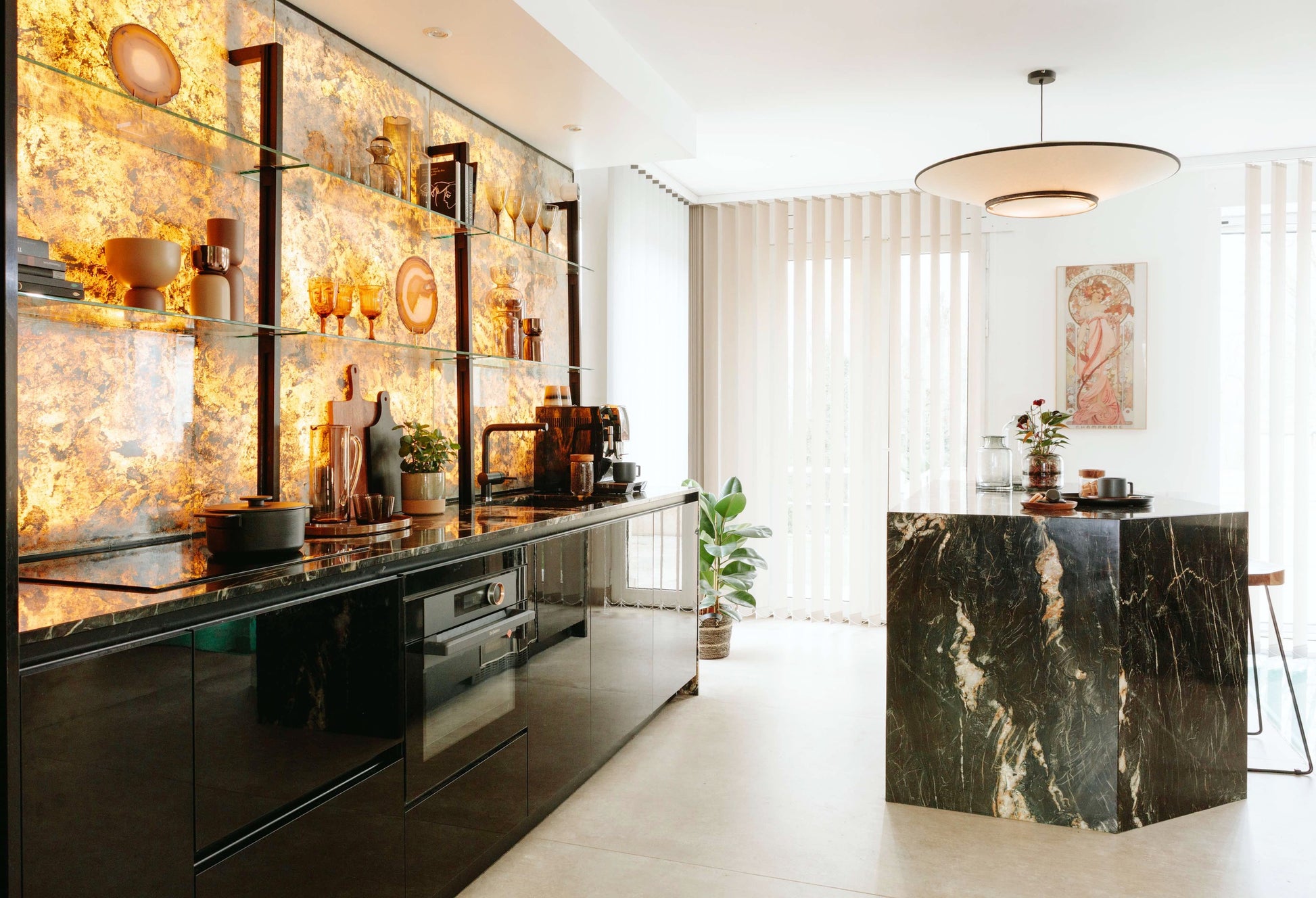 Ses tons chauds mêlant or, ambre et brun créent une diffusion lumineuse spectaculaire, idéale pour les projets décoratifs haut de gamme : bars, murs rétro-éclairés, crédences, spas ou halls d’hôtel.