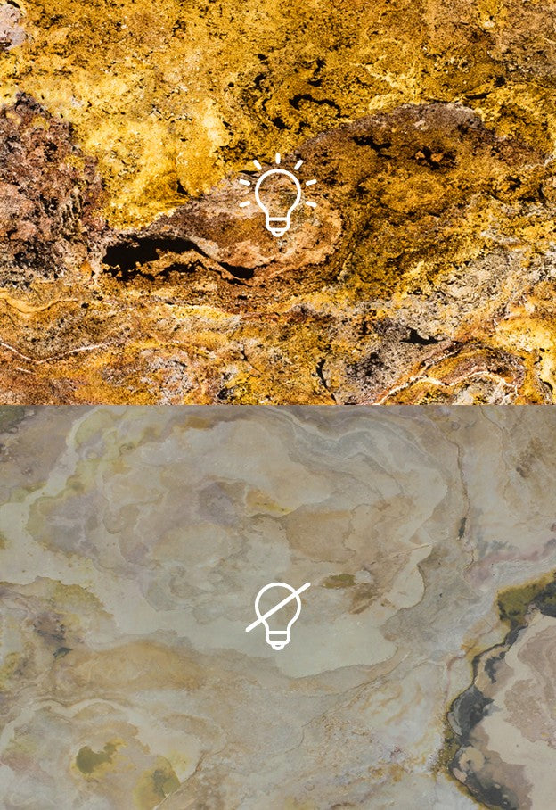 Véritable pierre naturelle flexible et rétro-éclairable, issue de strates d’ardoise dorée, la feuille SC-T01 transforme la lumière en matière vivante.